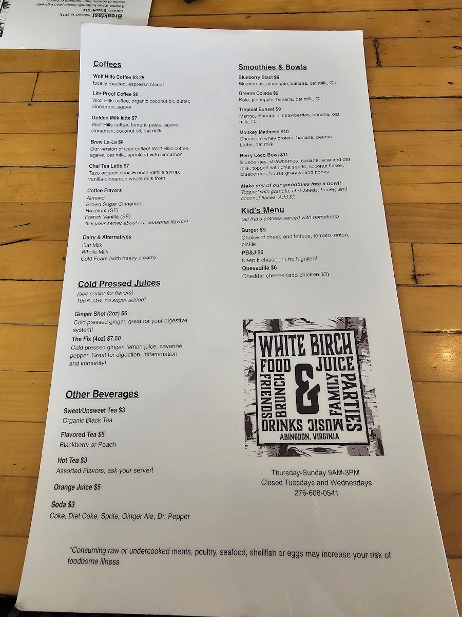 Welcome to White Birch Food Juice, a gem nestled in Abingdon, VA. Known for its warmth and welcoming atmosphere, this spot offers an unforgettable culinary experience. Their menu boasts a delightful selection of fresh juices and savory dishes, capturing the essence of wholesome eating.